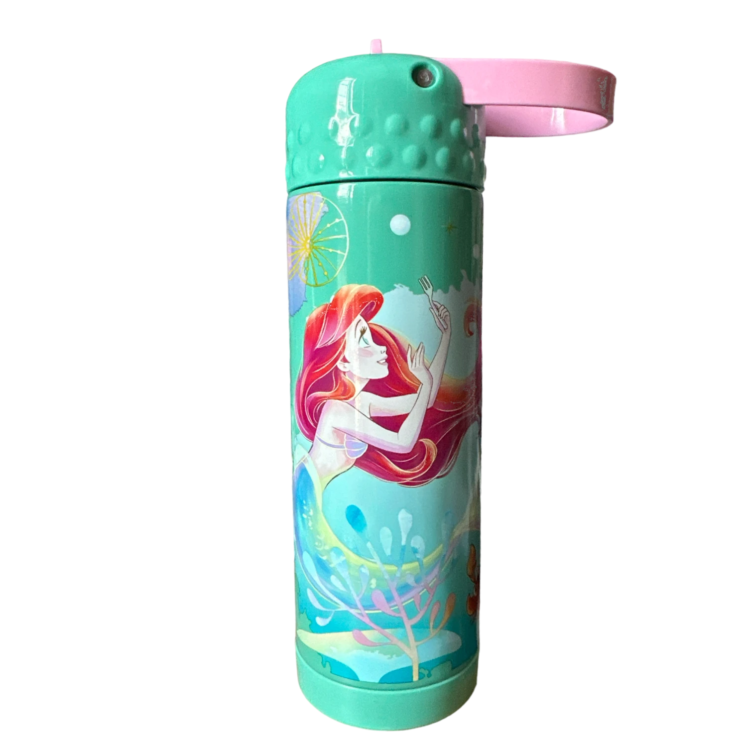 - Design : Cette gourde est ornée d’une image colorée d’Ariel, la princesse sirène de « La petite sirène », ajoutant une touche de magie Disney à votre journée.