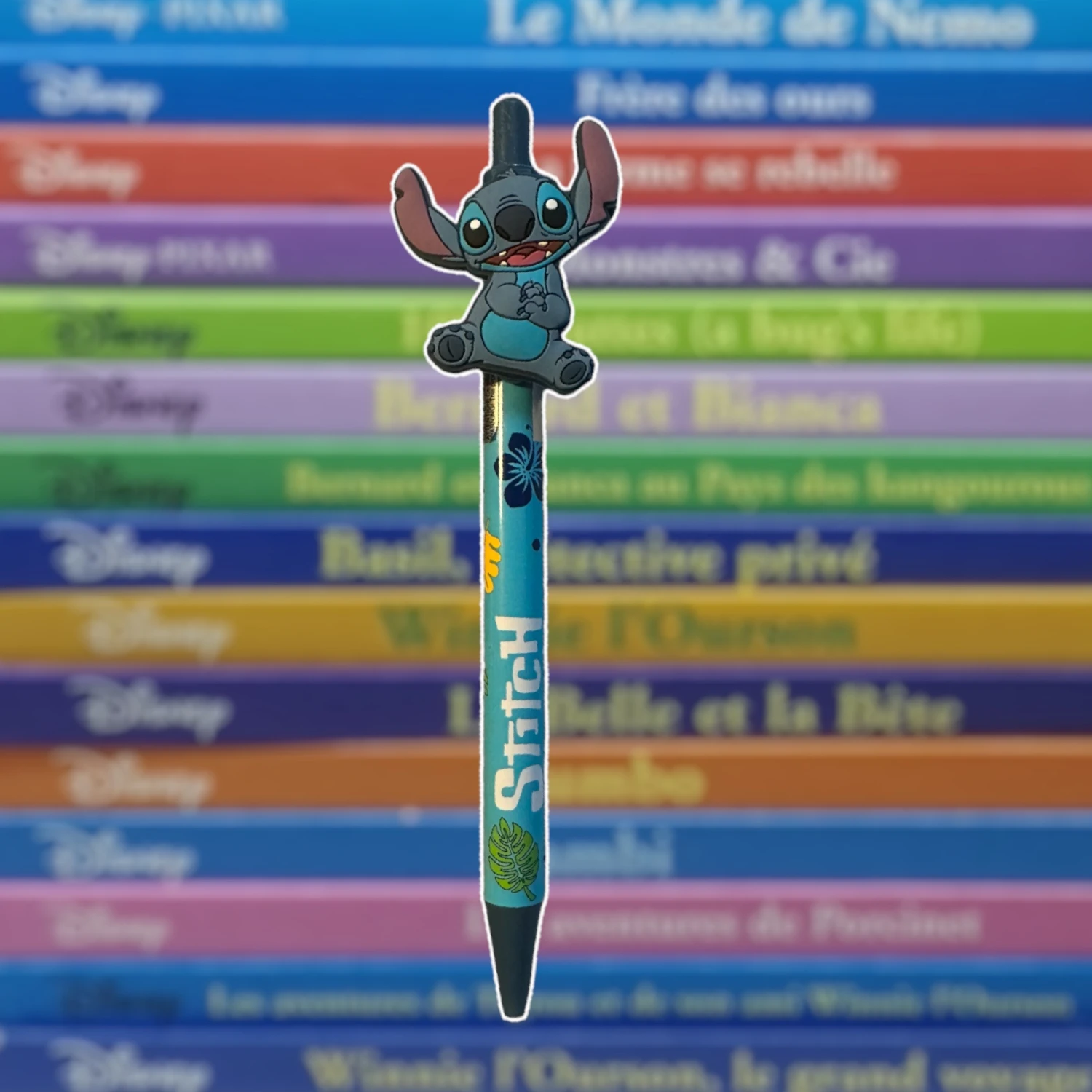 - Design Stitch : Ce stylo arbore une représentation détaillée et colorée de Stitch, le personnage principal de Lilo et Stitch.
